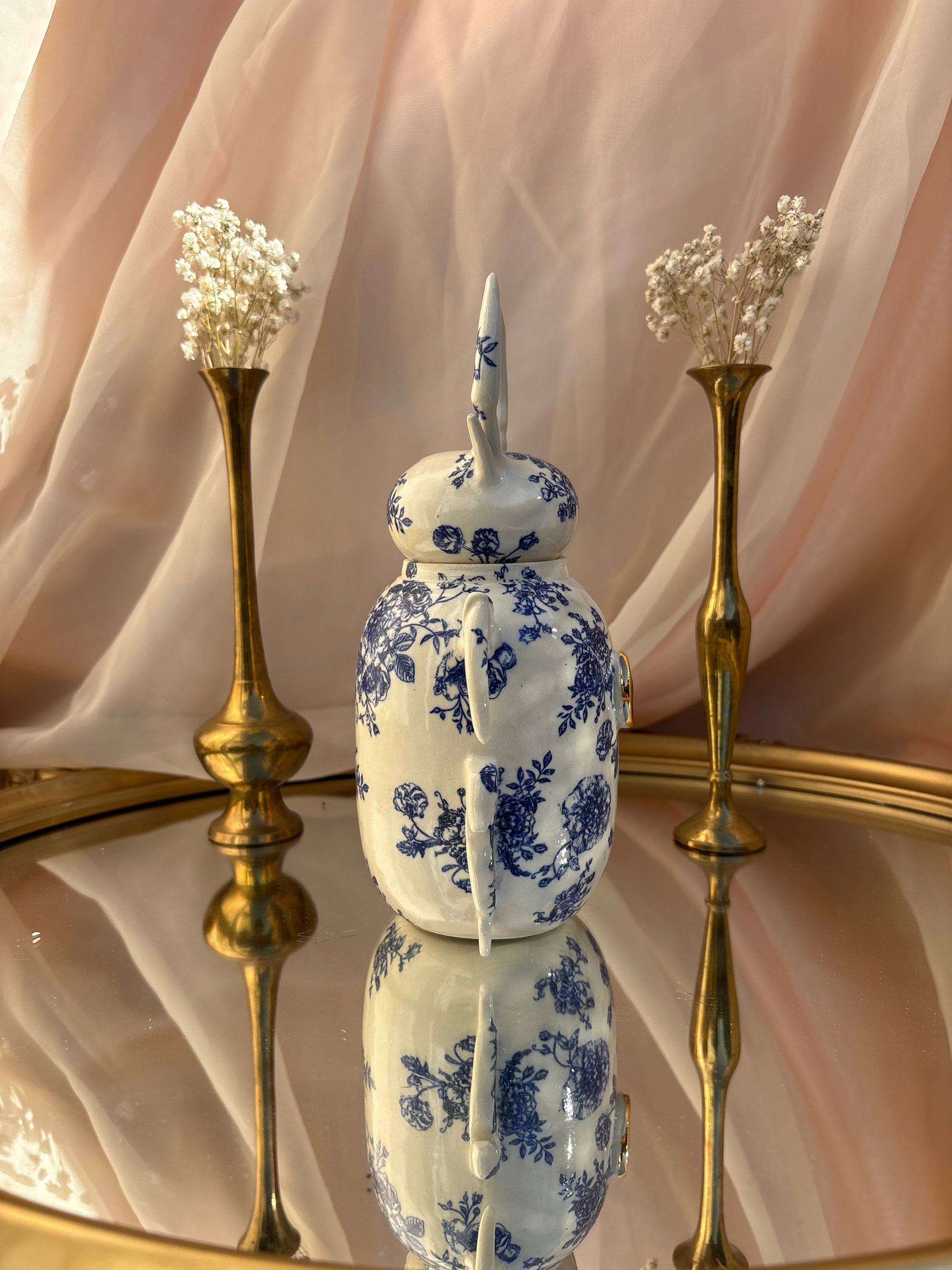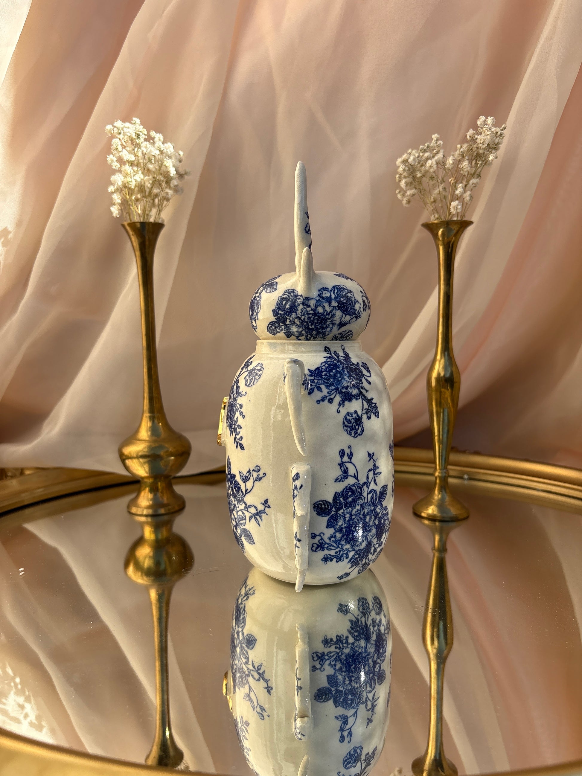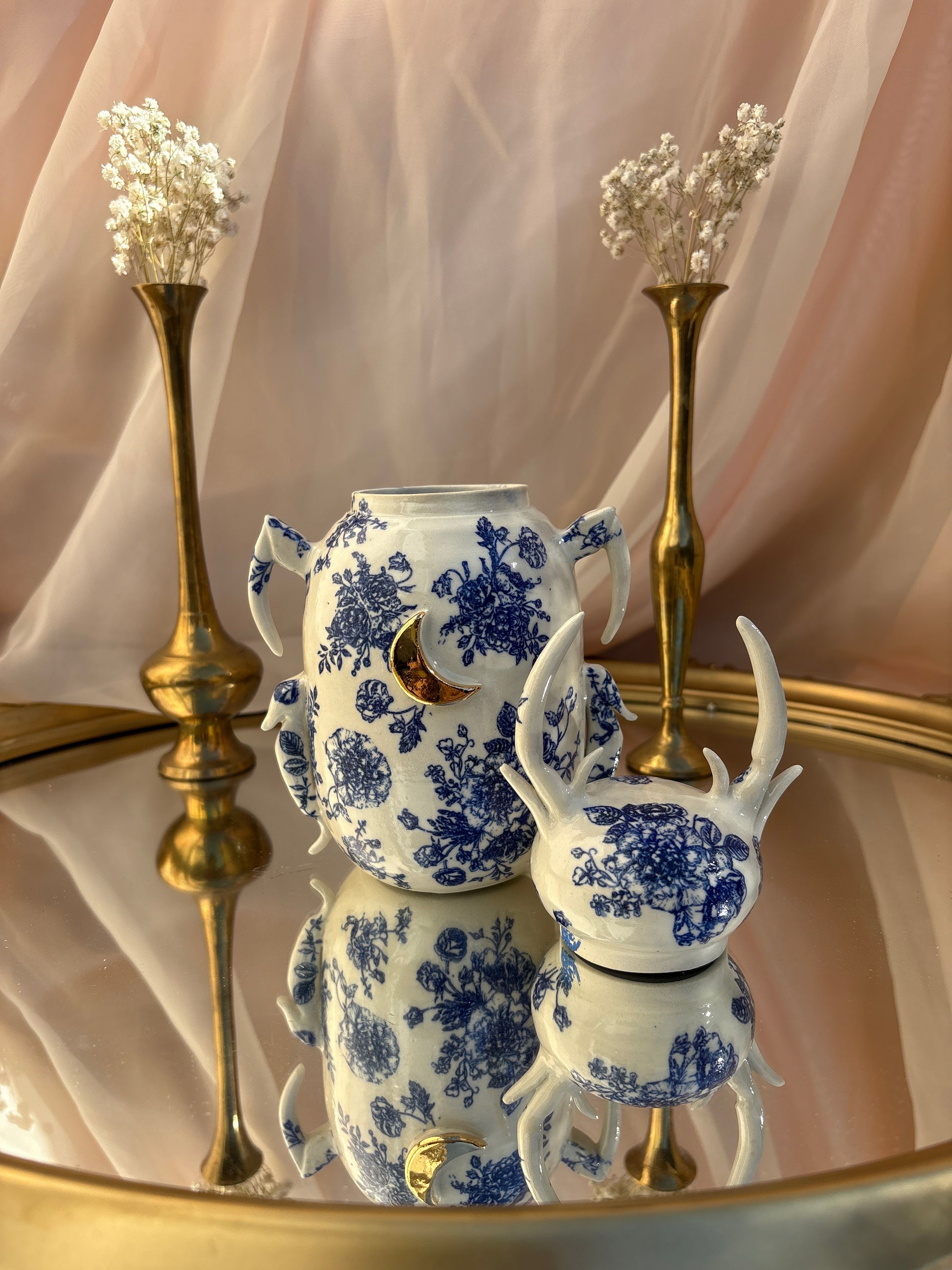 Each piece is personally handcrafted and one of a kind. Sizes vary, and imperfections are likely to be present because of the handmade nature of the piece. Each piece is wheel thrown, trimmed, assembled, fired, glazed, fired, lustred (if gold is present), and fired again. The process takes a month to two months to complete.