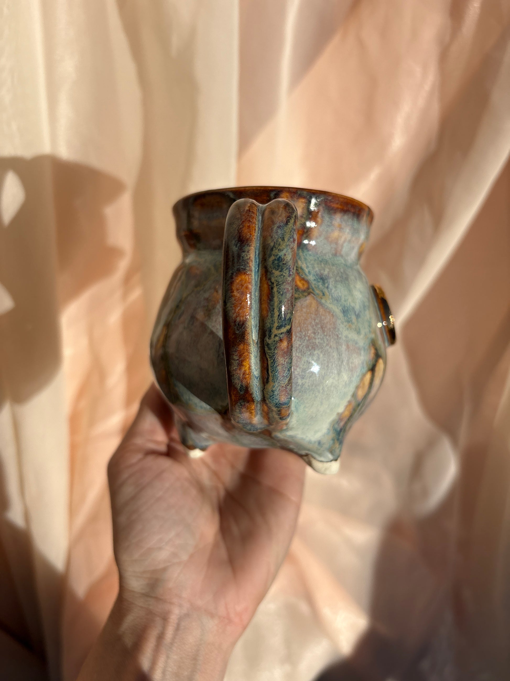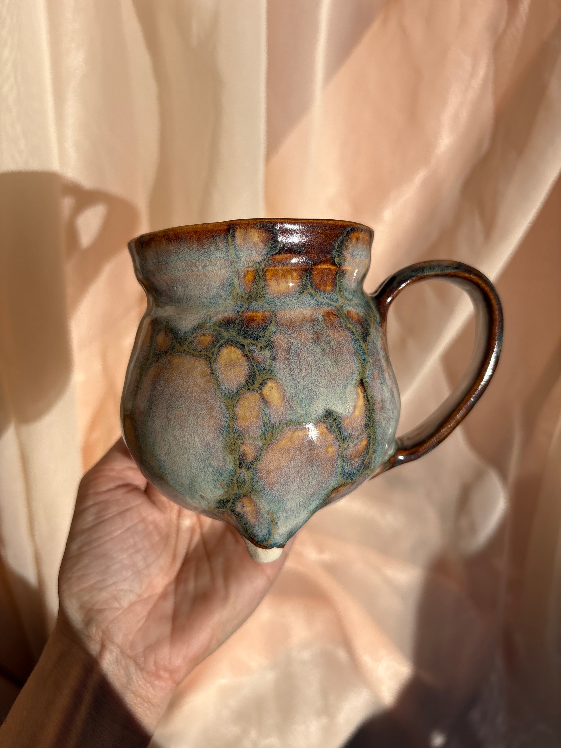 This handcrafted mug mirrors the soft ripples of rain echoing across the quiet waters, blending earthy tones and flowing blues into a vessel of calm and warmth.Let this mug be your ritual companion to help ground you in moments of reflection, solitude, and regulation with every sip.