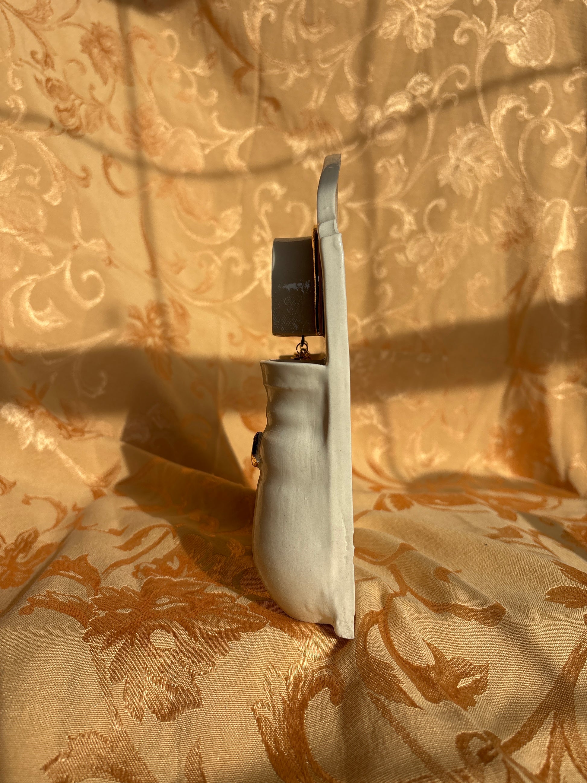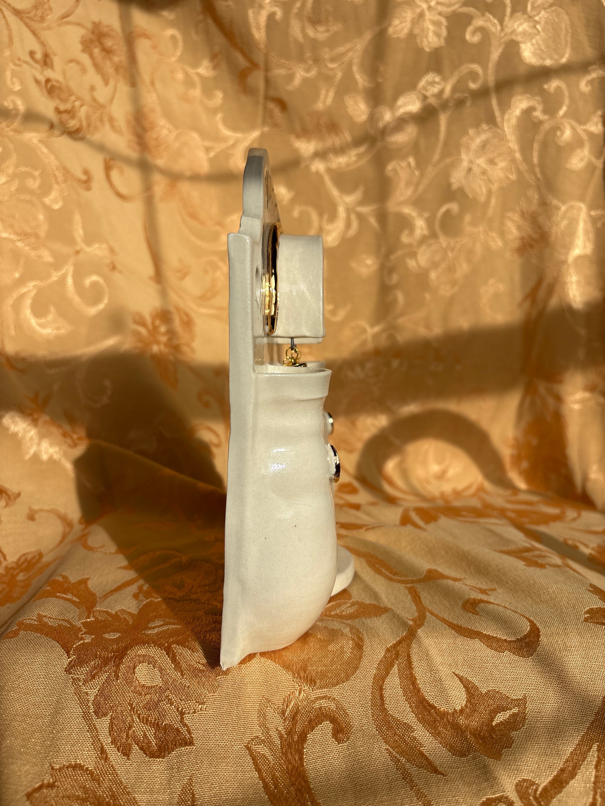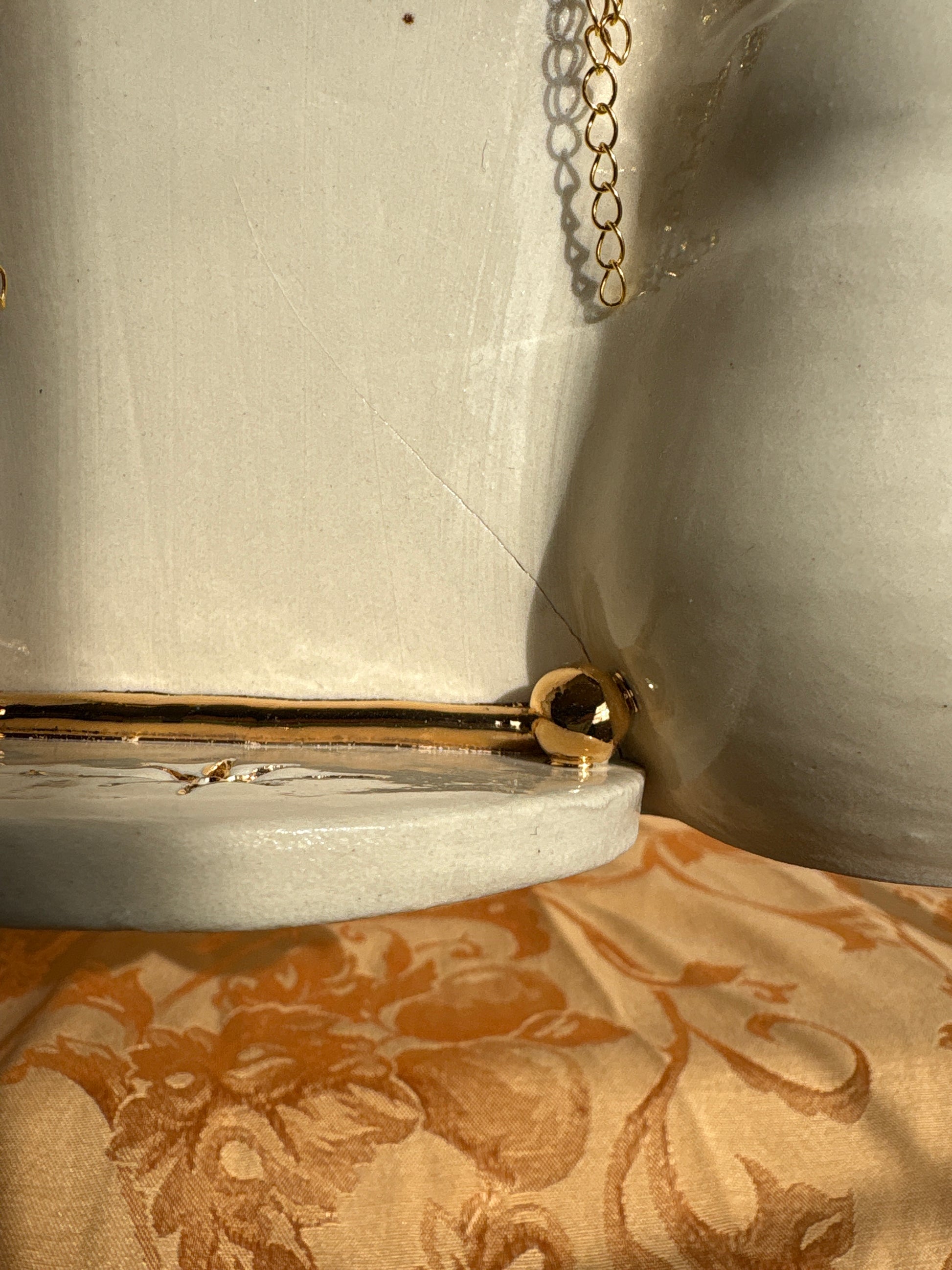 Each piece is personally handcrafted and one of a kind. Sizes vary, and imperfections are likely to be present because of the handmade nature of the piece. Each piece is wheel thrown, trimmed, assembled, fired, glazed, fired, lustred (if gold is present), and fired again. The process takes a month to two months to complete.