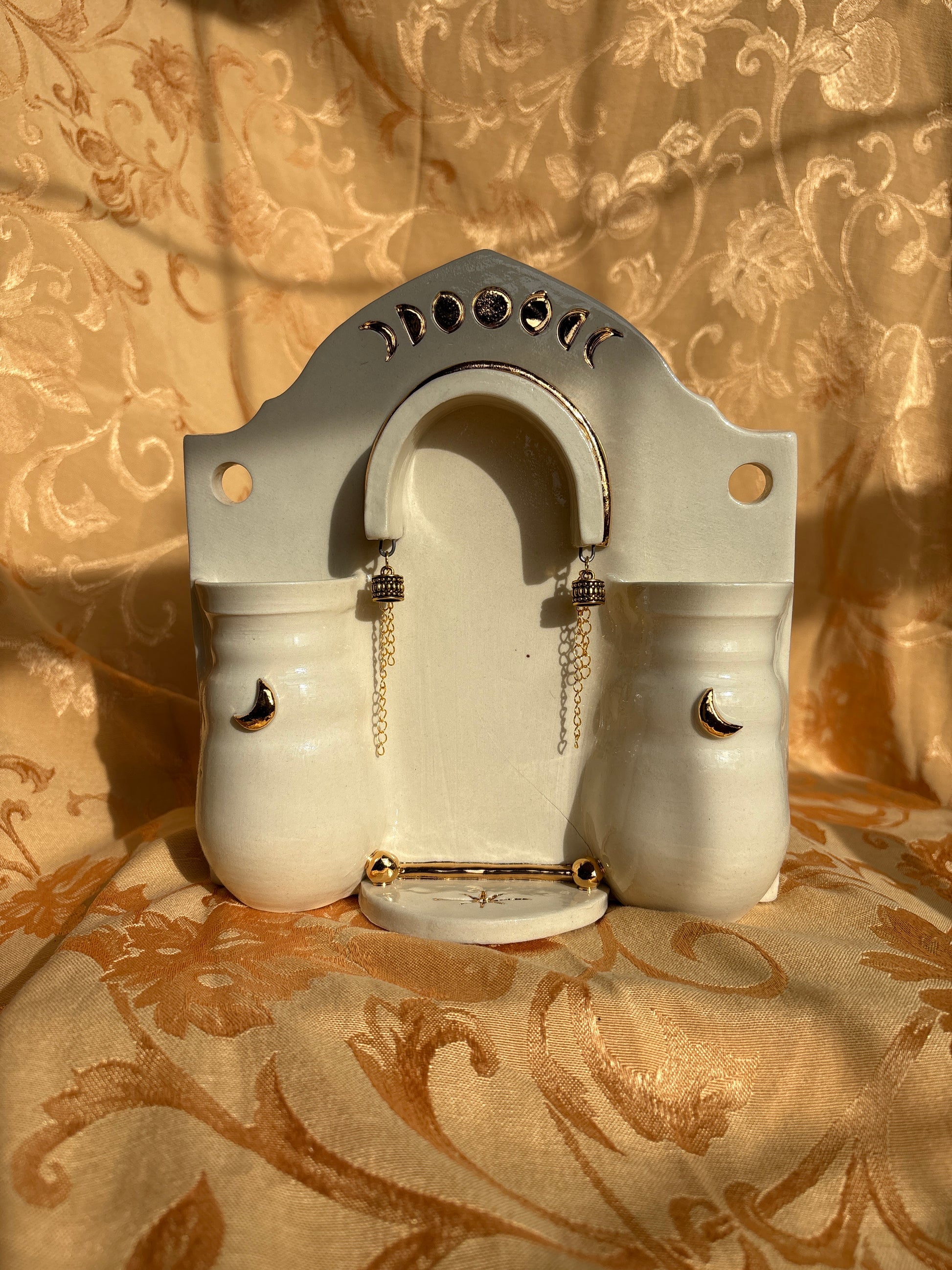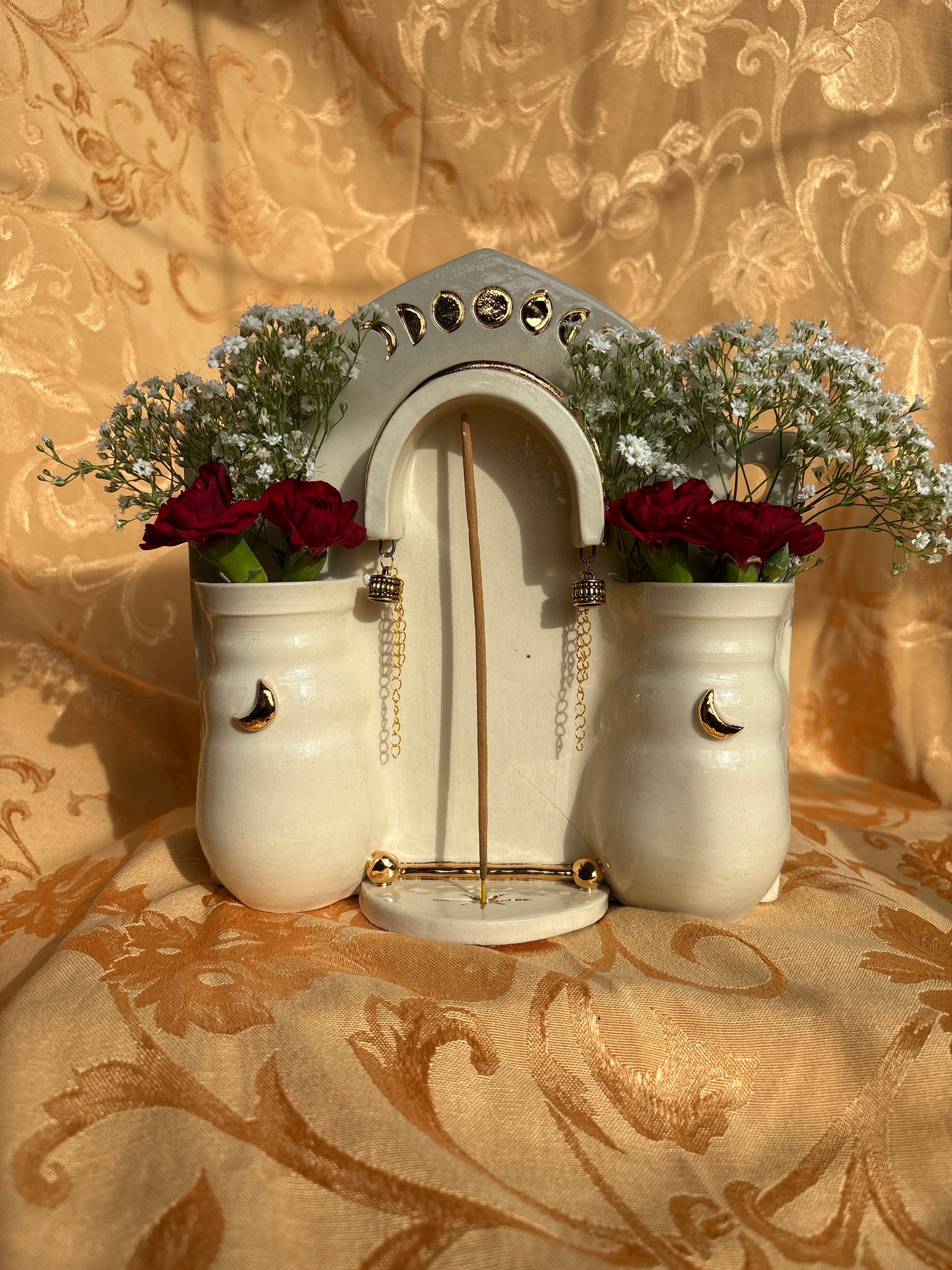 Honor your sacred spaces and corners with this handcrafted flower altar. Designed to serve as a quiet catalyst for your meditations, readings, and connections. Make offerings to your ancestors, set your intentions, or use as an incense holder to cleanse your space.