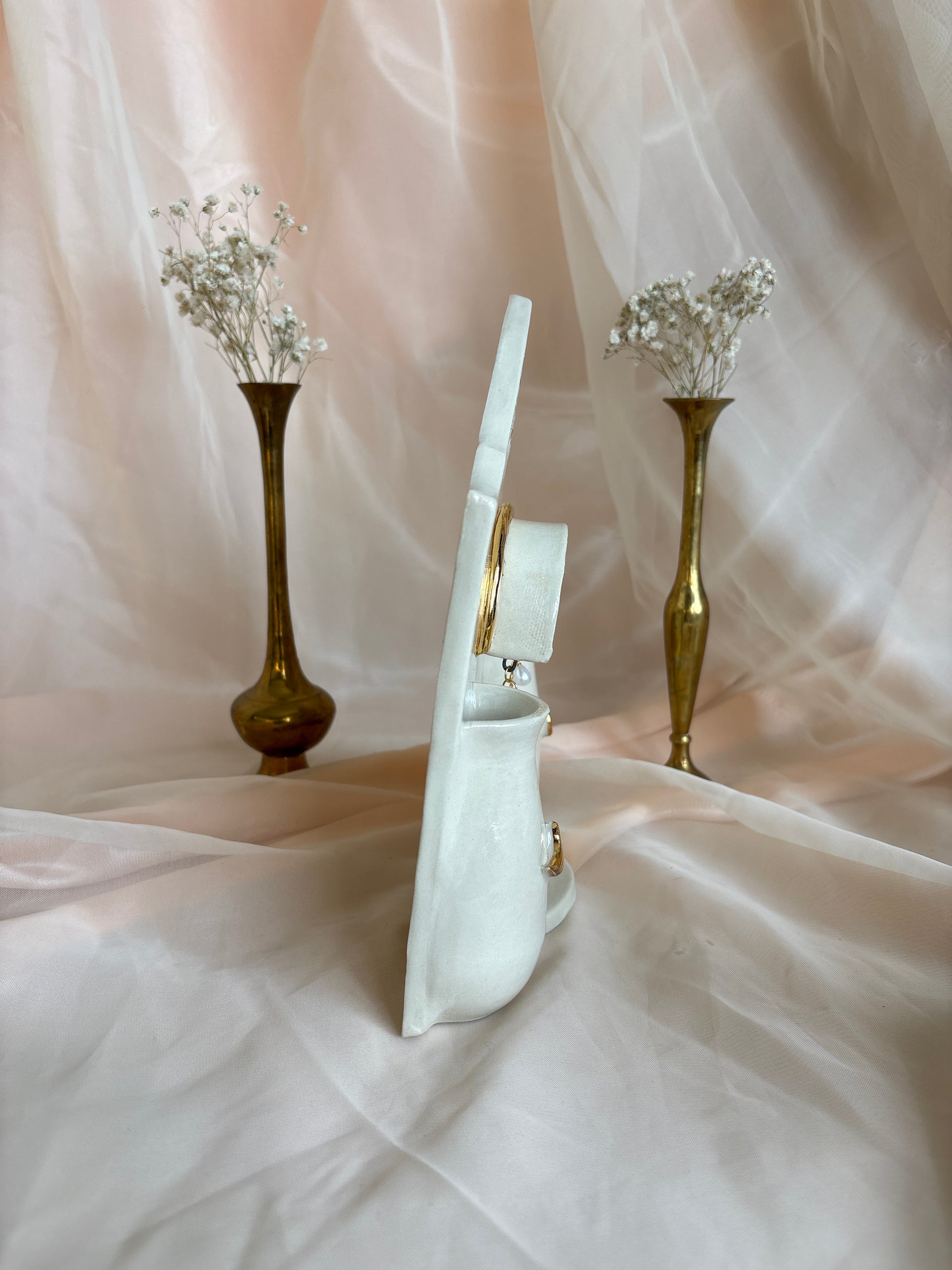 Each piece is personally handcrafted and one of a kind. Sizes vary, and imperfections are likely to be present because of the handmade nature of the piece. Each piece is wheel thrown, trimmed, assembled, fired, glazed, fired, lustred (if gold is present), and fired again. The process takes a month to two months to complete.