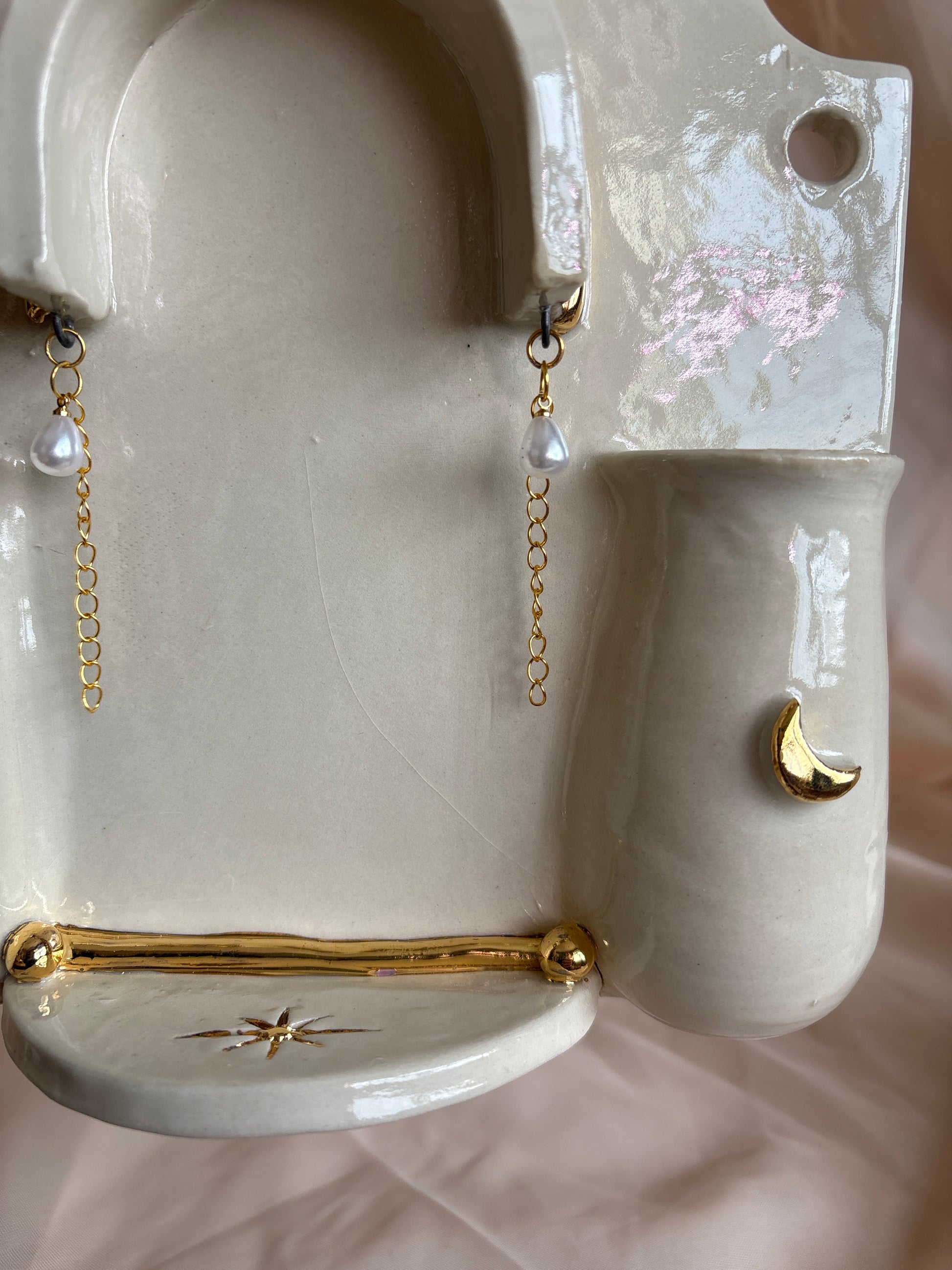 Each piece is personally handcrafted and one of a kind. Sizes vary, and imperfections are likely to be present because of the handmade nature of the piece. Each piece is wheel thrown, trimmed, assembled, fired, glazed, fired, lustred (if gold is present), and fired again. The process takes a month to two months to complete.