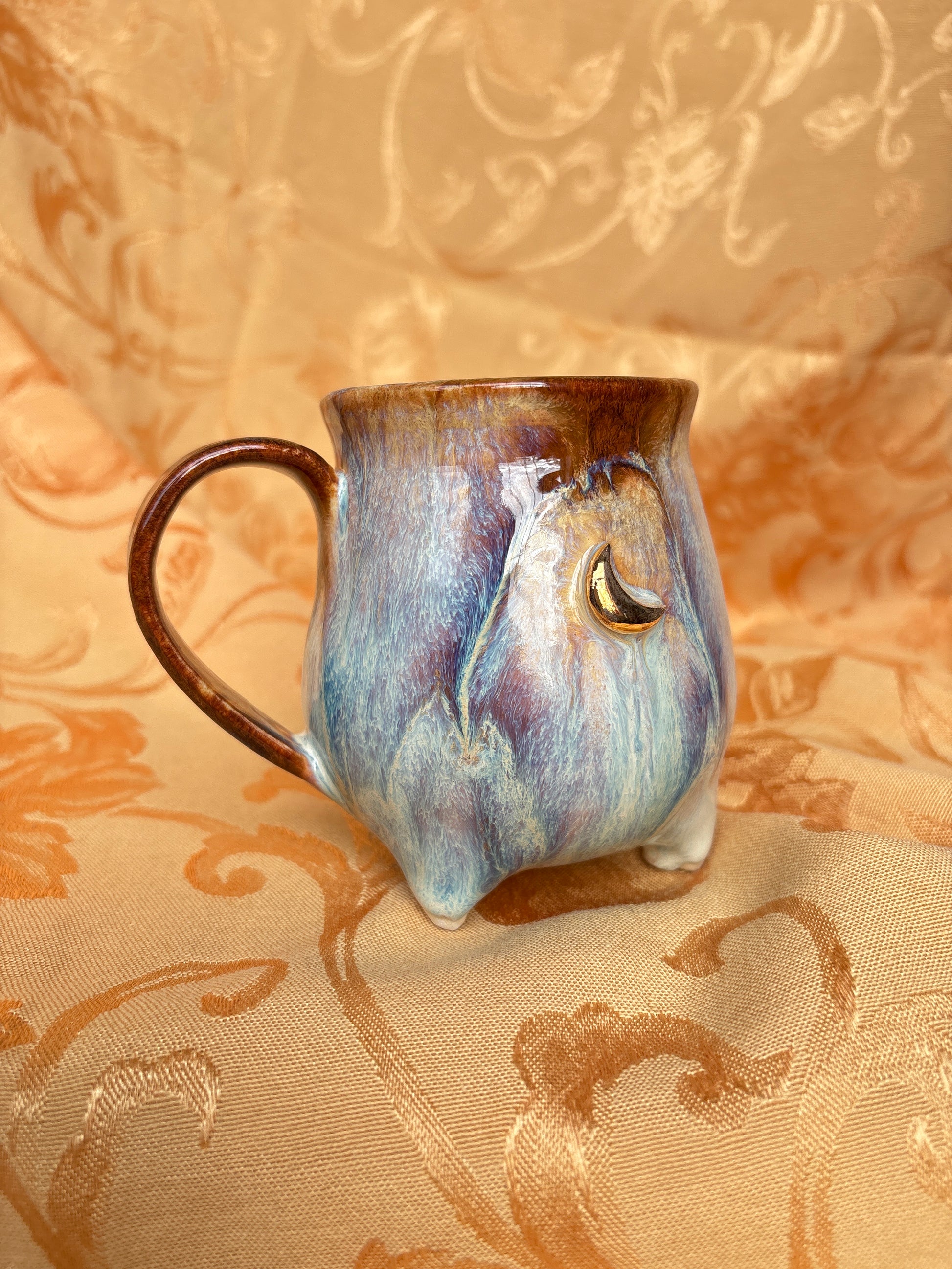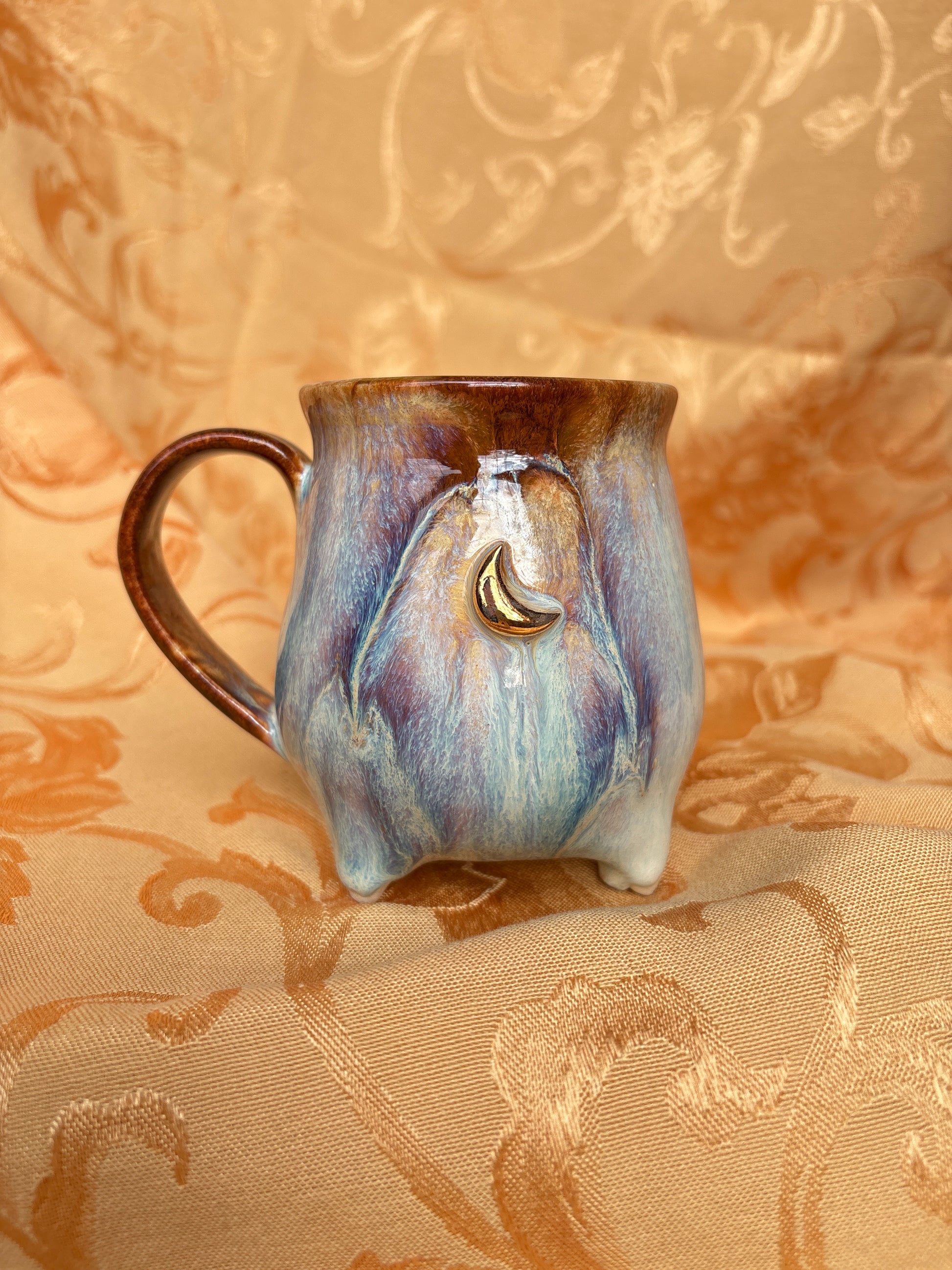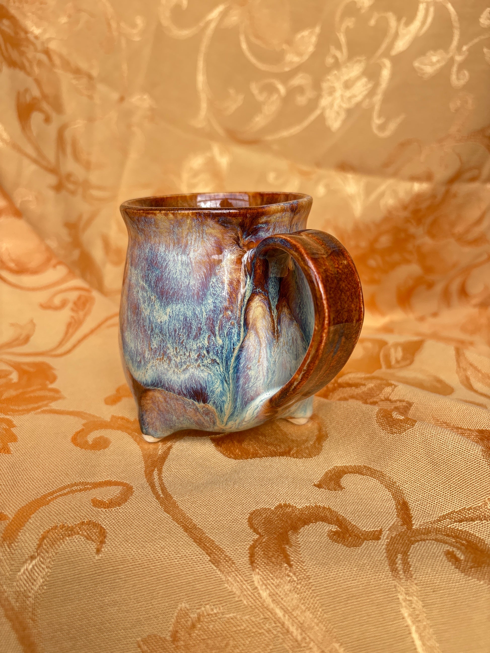 A vessel shaped by cosmic fire and shifting terrain. This cauldron mug swirls with the raw beauty of Mars: ribbons of earthen red, deep blue, and windswept tan, like ancient canyons traced by stardust and silence. It holds the energy of transformation, drive, and grounded strength; a quiet echo of the planet’s untamed spirit.