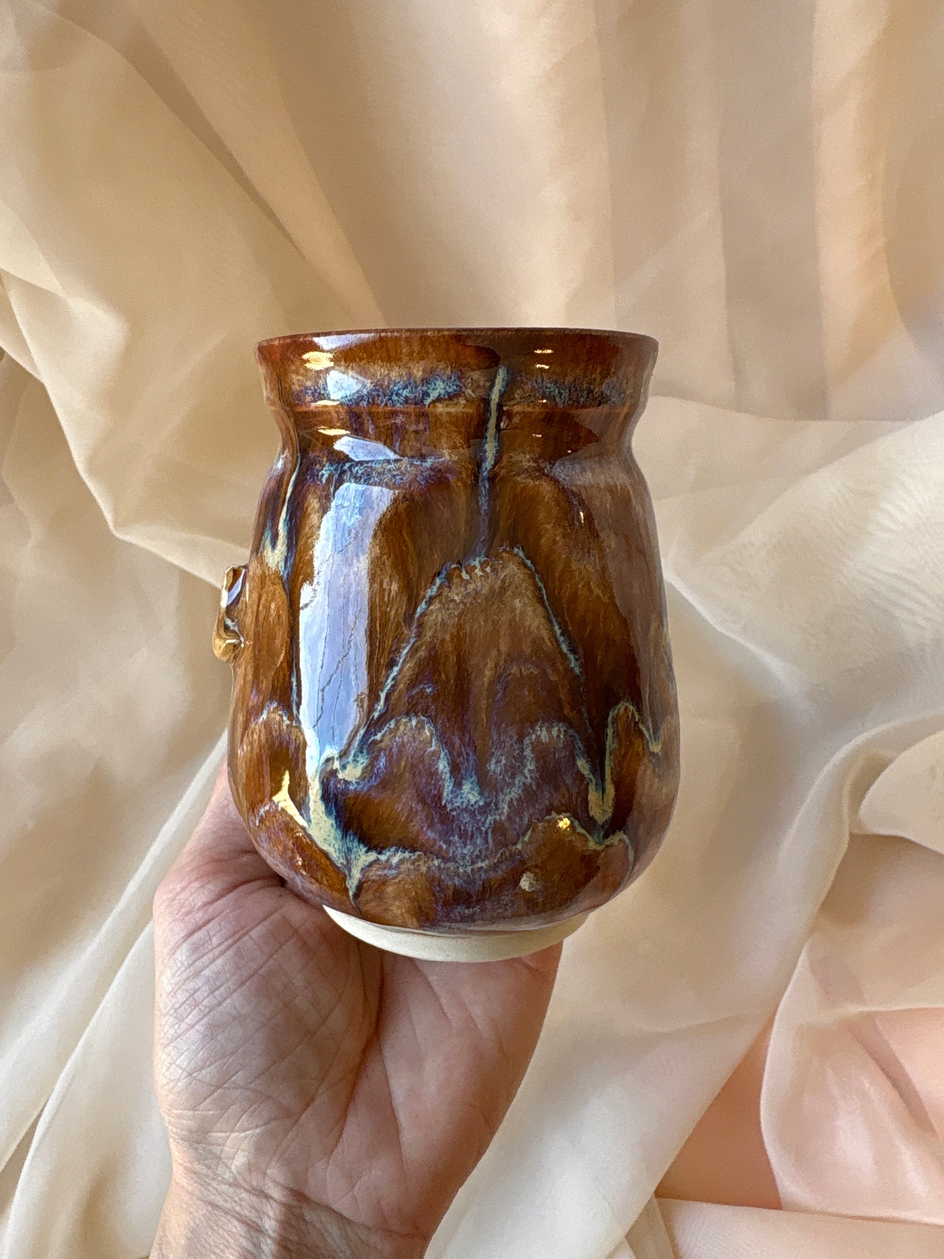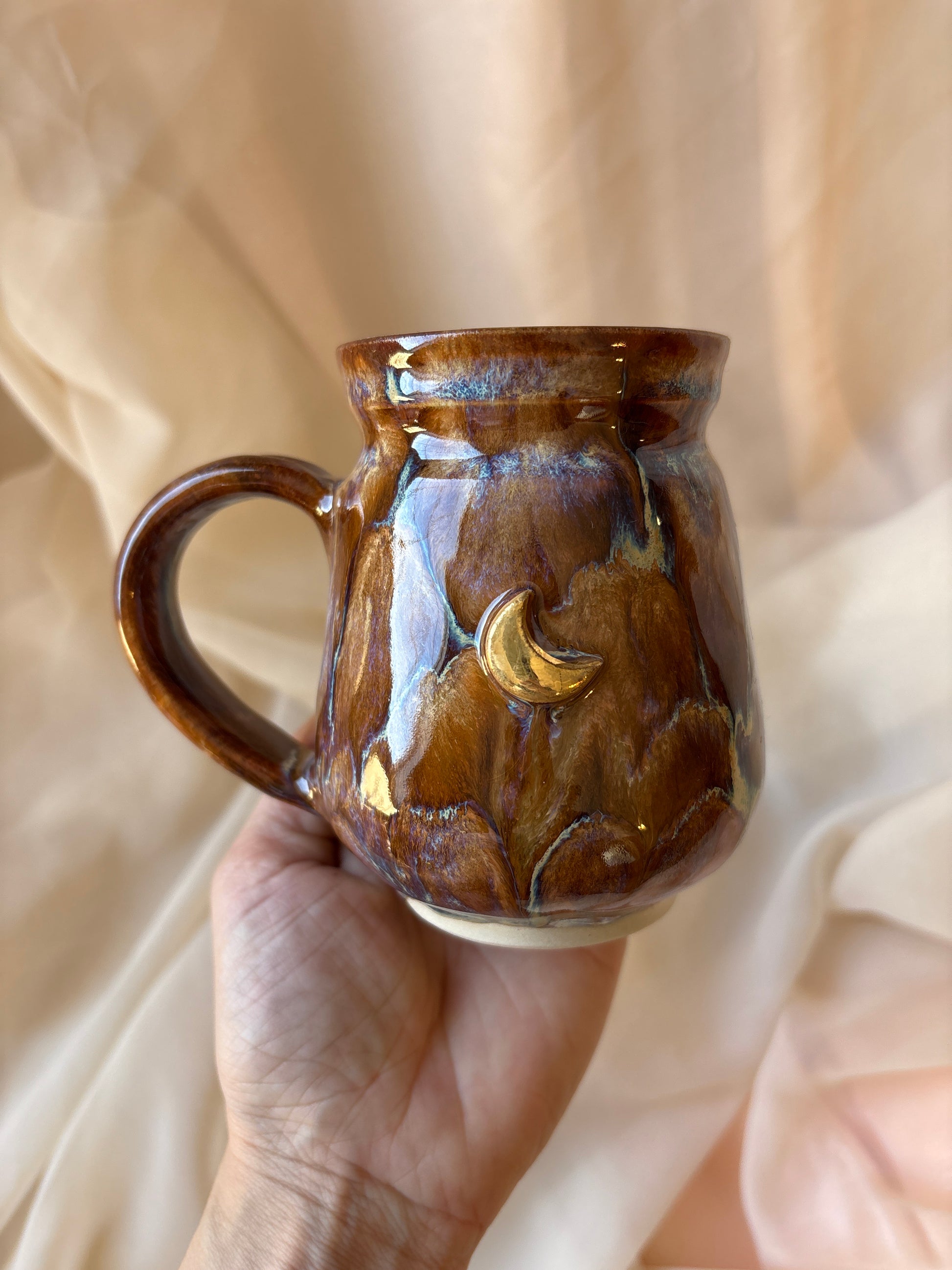 Each piece is personally handcrafted and one of a kind. Sizes vary, and imperfections are likely to be present because of the handmade nature of the piece. Each piece is wheel thrown, trimmed, assembled, fired, glazed, fired, lustred (if gold is present), and fired again. The process takes a month to two months to complete.