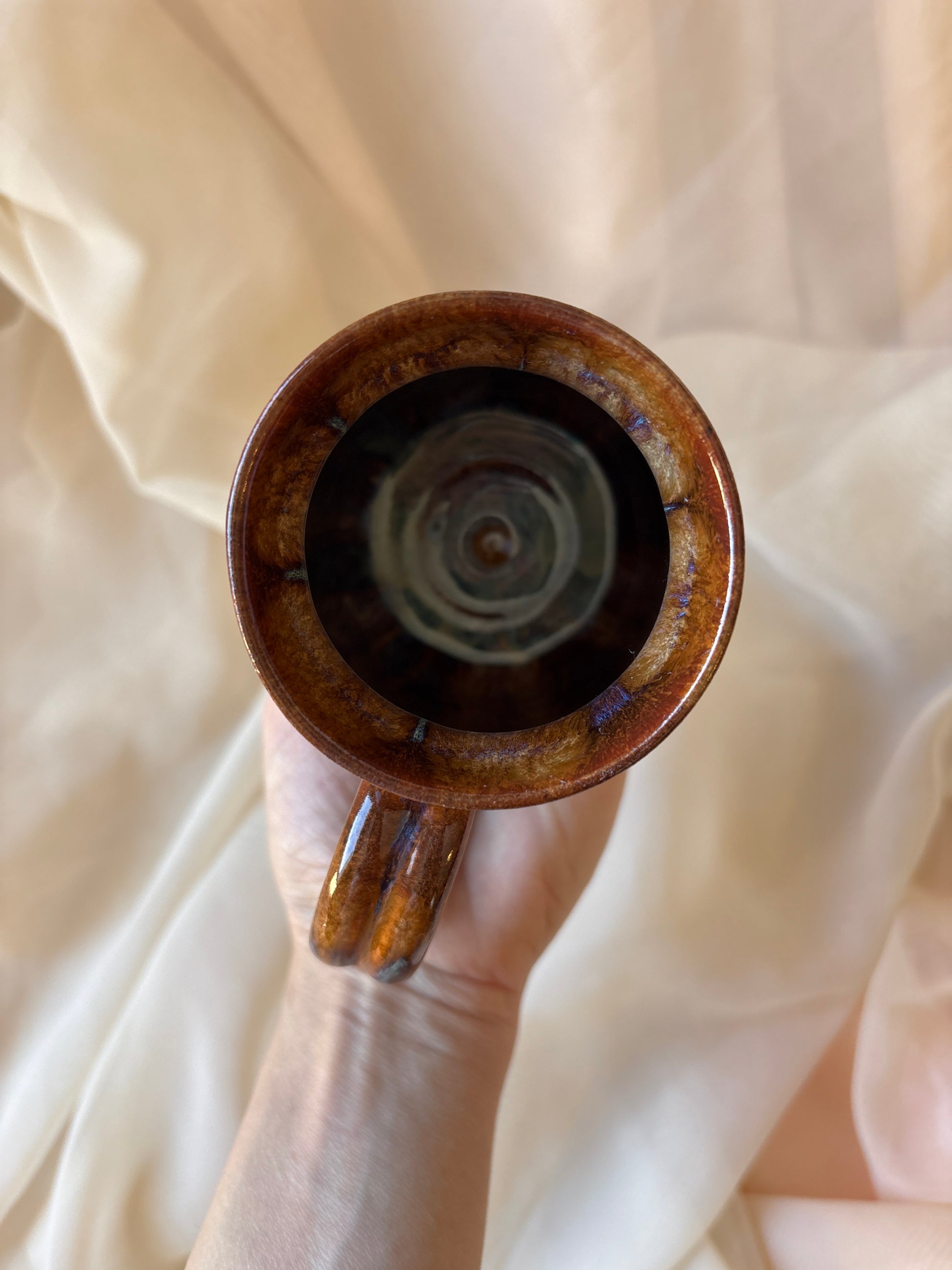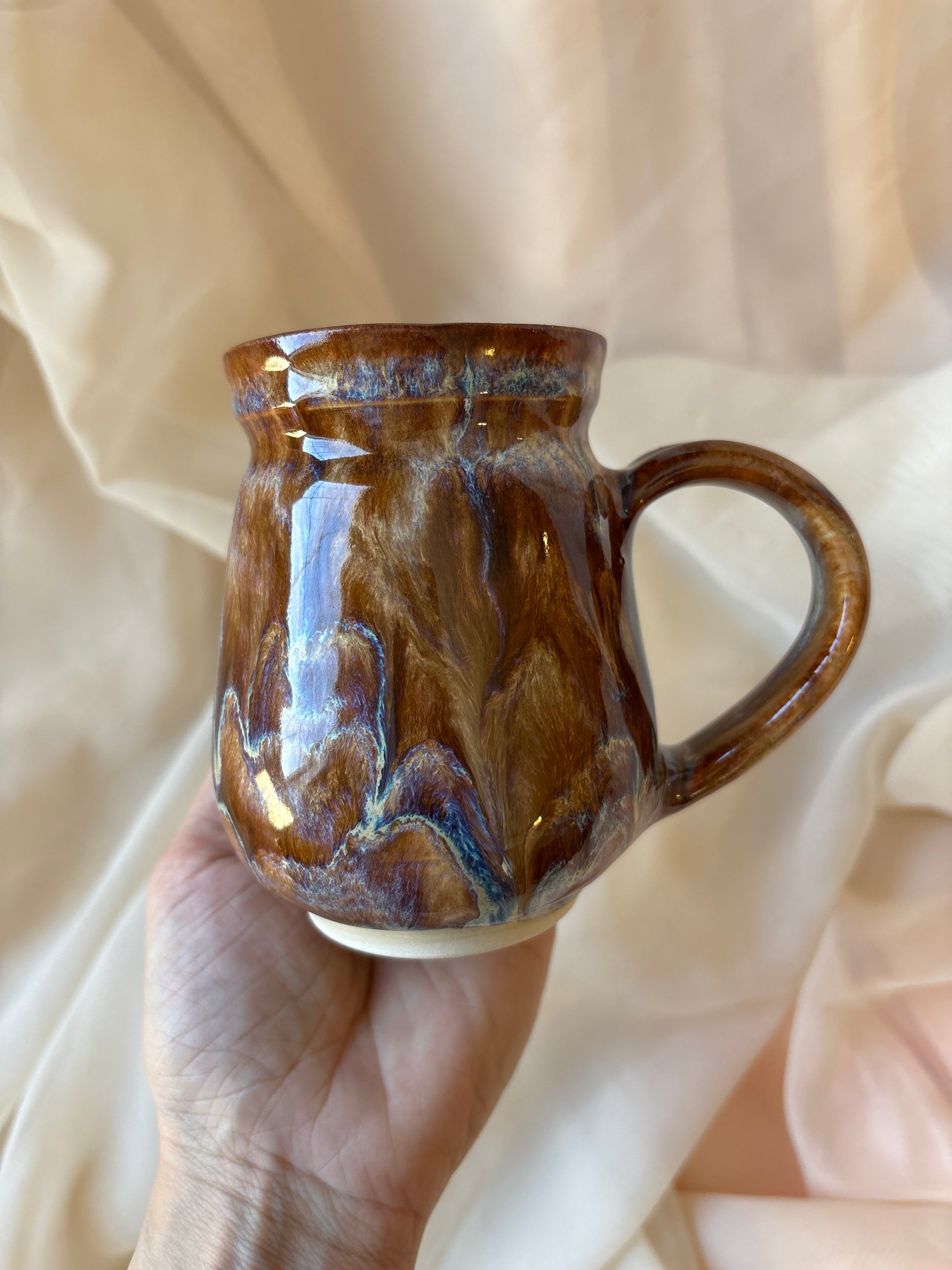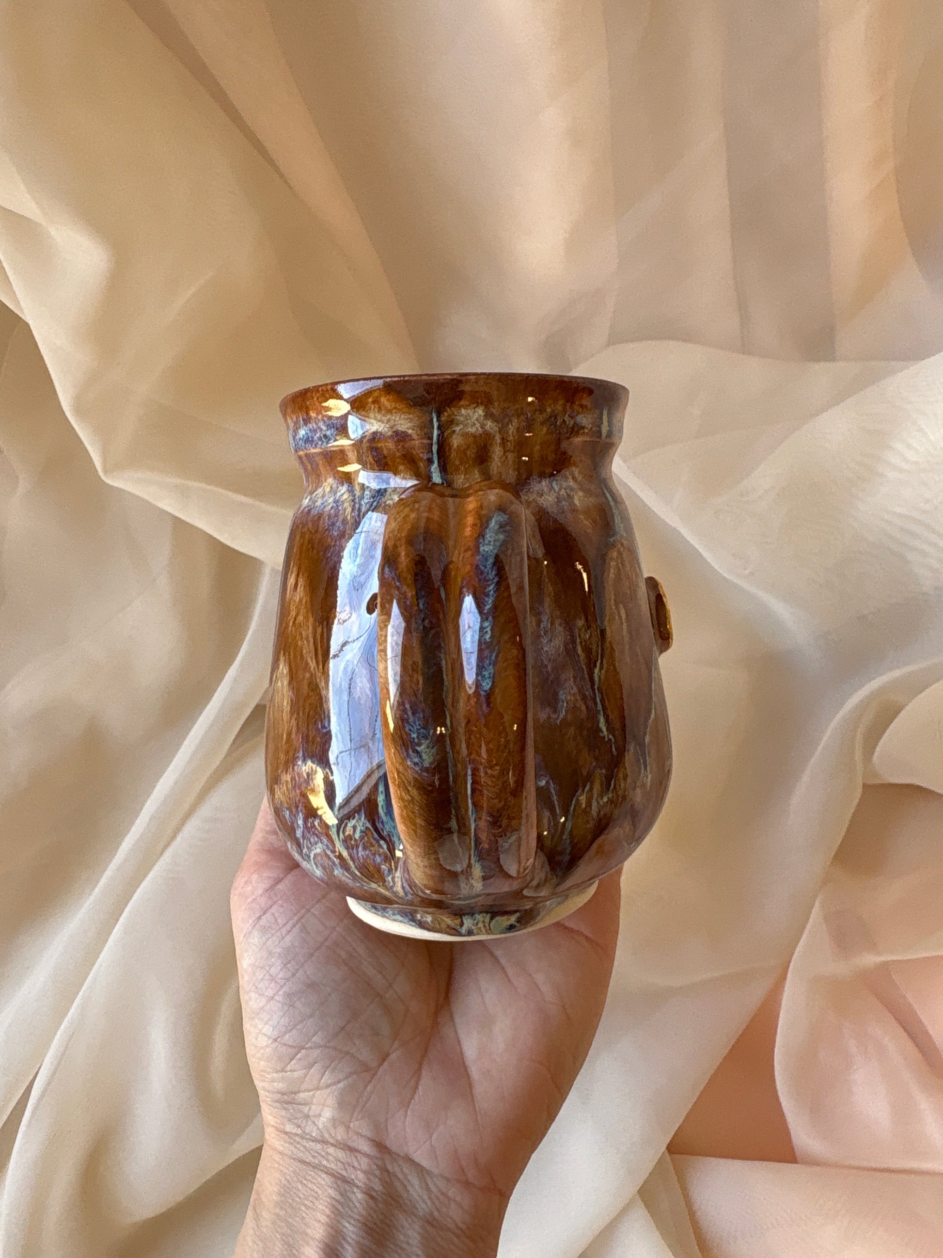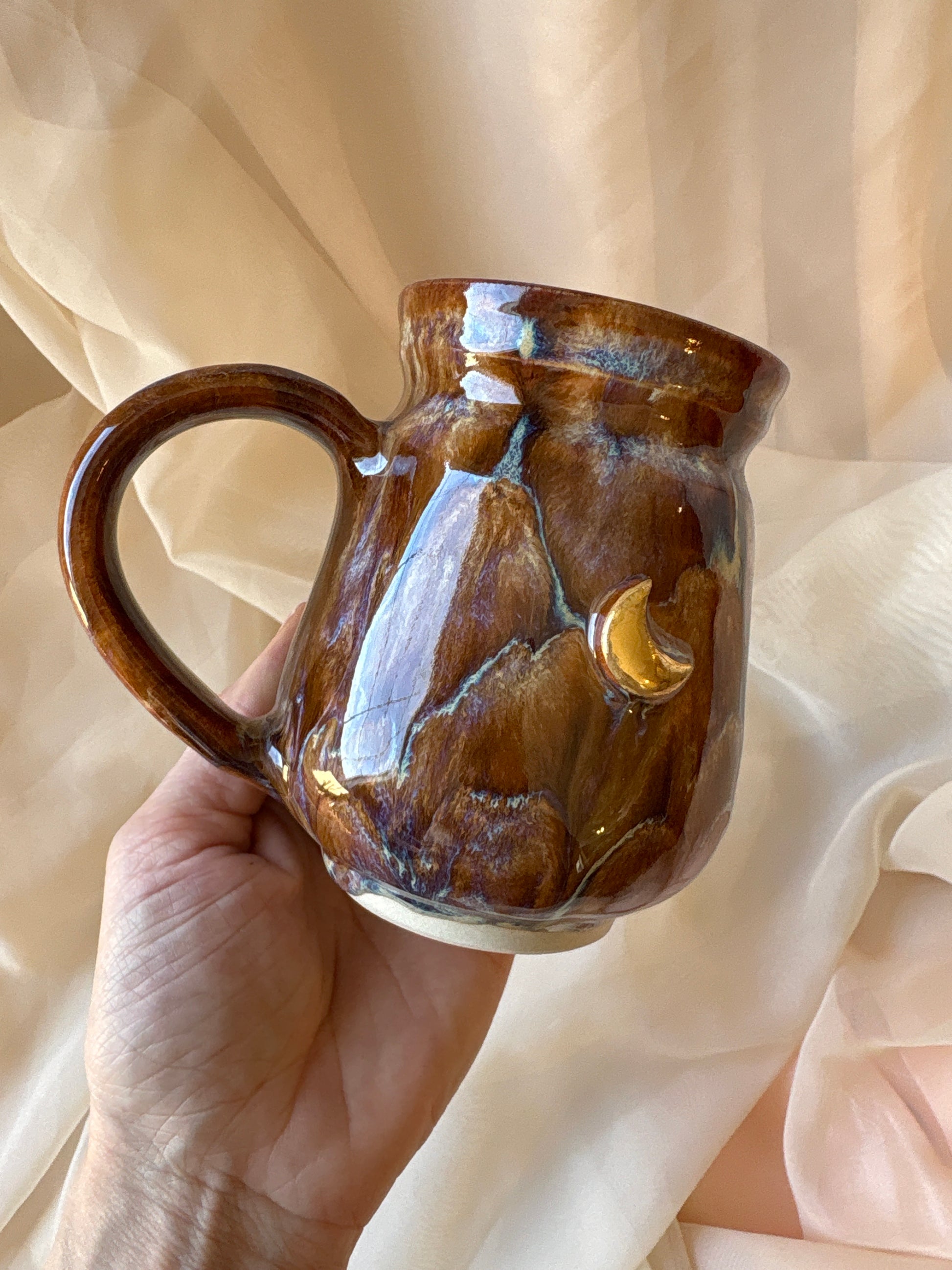 A vessel shaped by cosmic fire and shifting terrain. This cauldron mug swirls with the raw beauty of Mars: ribbons of earthen red, deep blue, and windswept tan, like ancient canyons traced by stardust and silence. It holds the energy of transformation, drive, and grounded strength; a quiet echo of the planet’s untamed spirit.