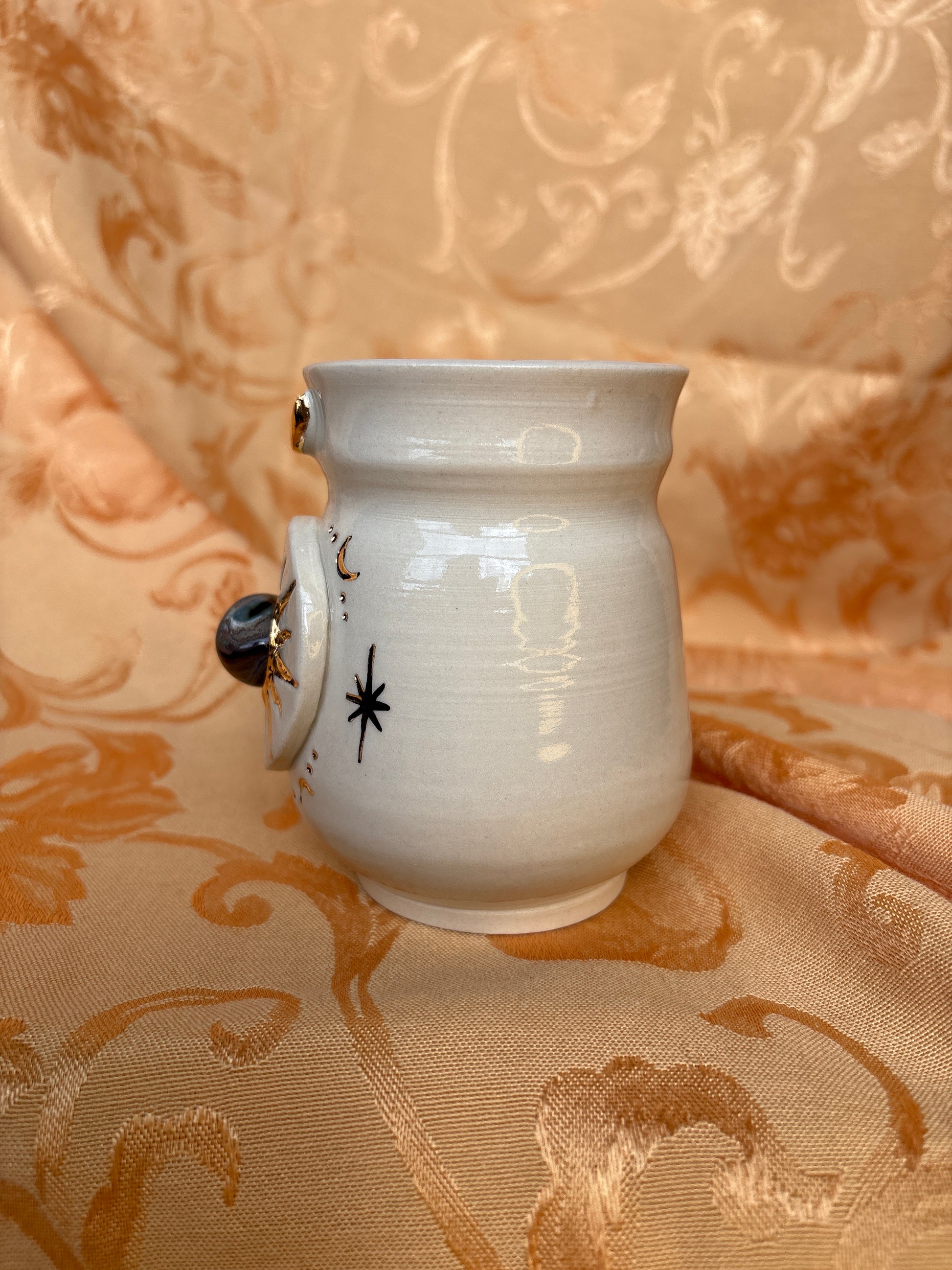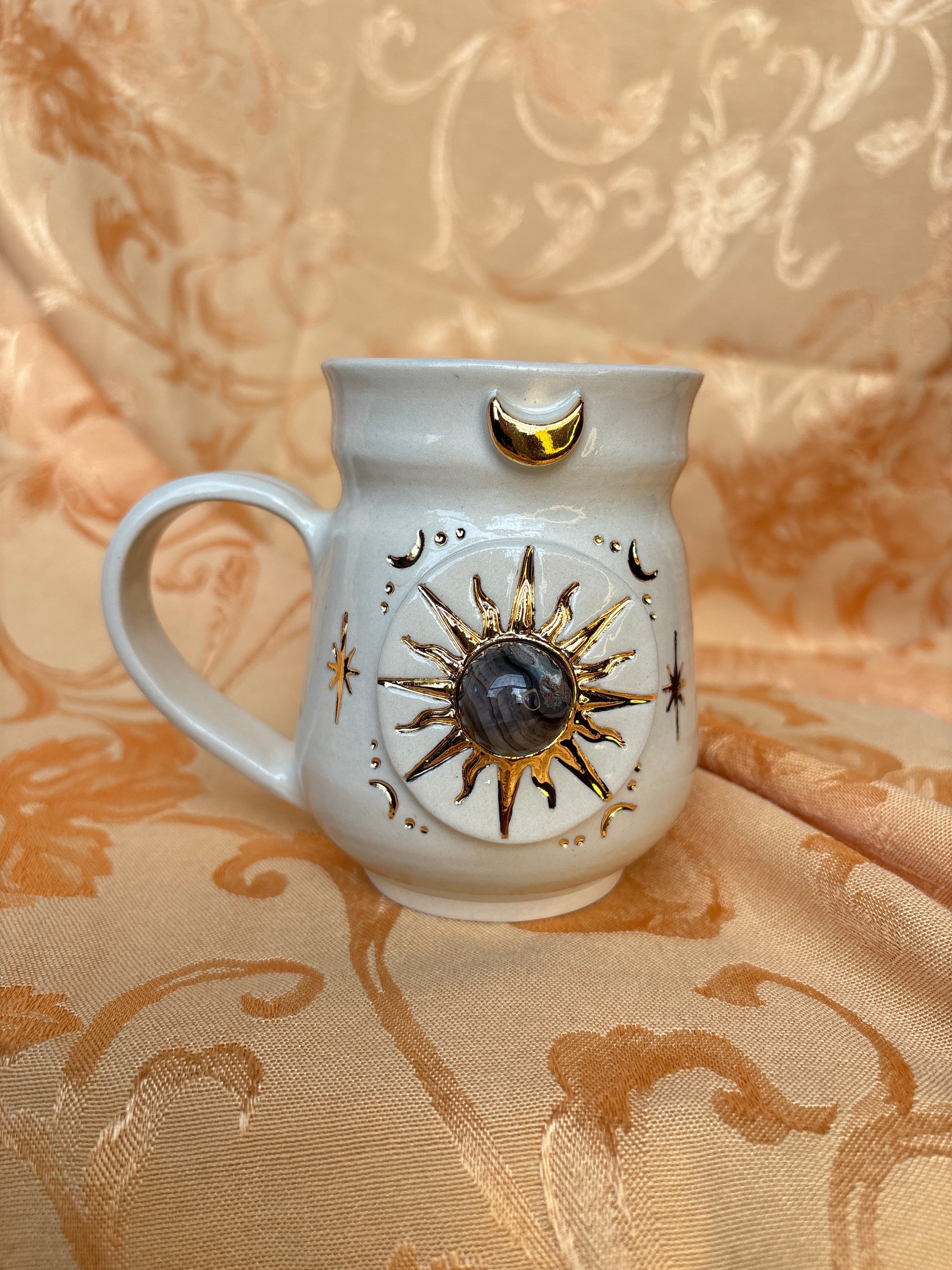 An ethereal mug to begin your morning rituals. Inspired by the Oracles - those who speak in symbols, dreams, and riddles, channeling wisdom from beyond themselves. The center of the mug is a stunning Agate blended with quartz. This stone carries the energy of spring after the storm, offering calm, balance, and quiet restoration.
