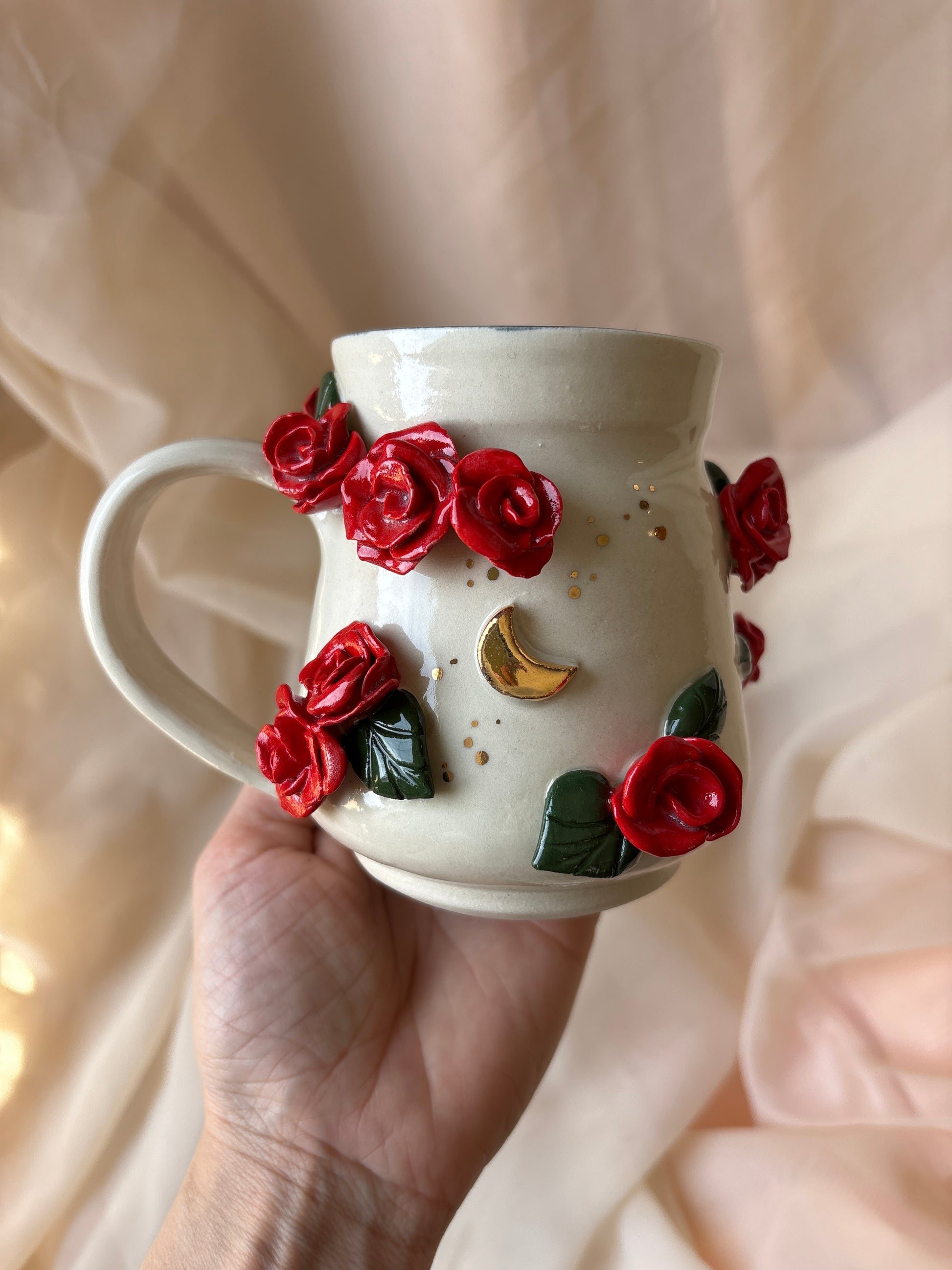 Each piece is personally handcrafted and one of a kind. Sizes vary, and imperfections are likely to be present because of the handmade nature of the piece. Each piece is wheel thrown, trimmed, assembled, fired, glazed, fired, lustred (if gold is present), and fired again. The process takes a month to two months to complete.