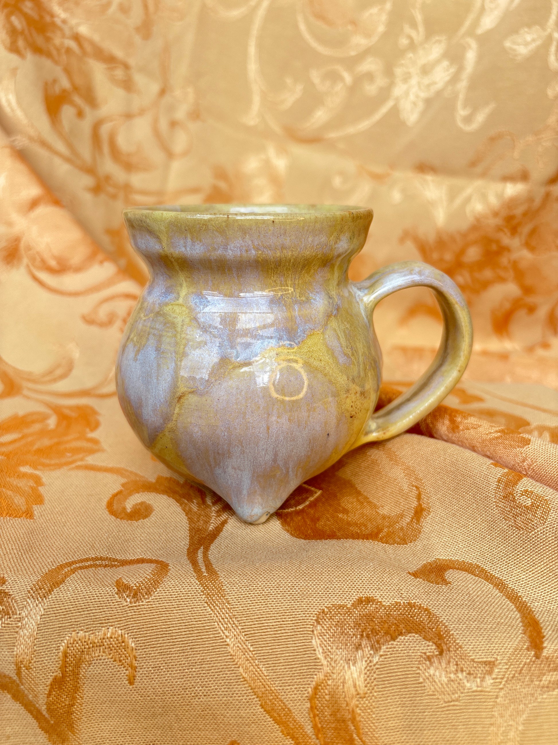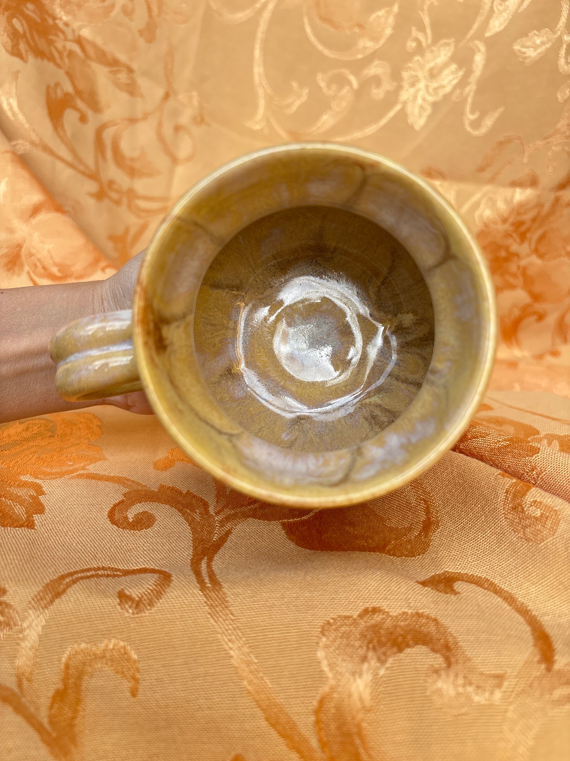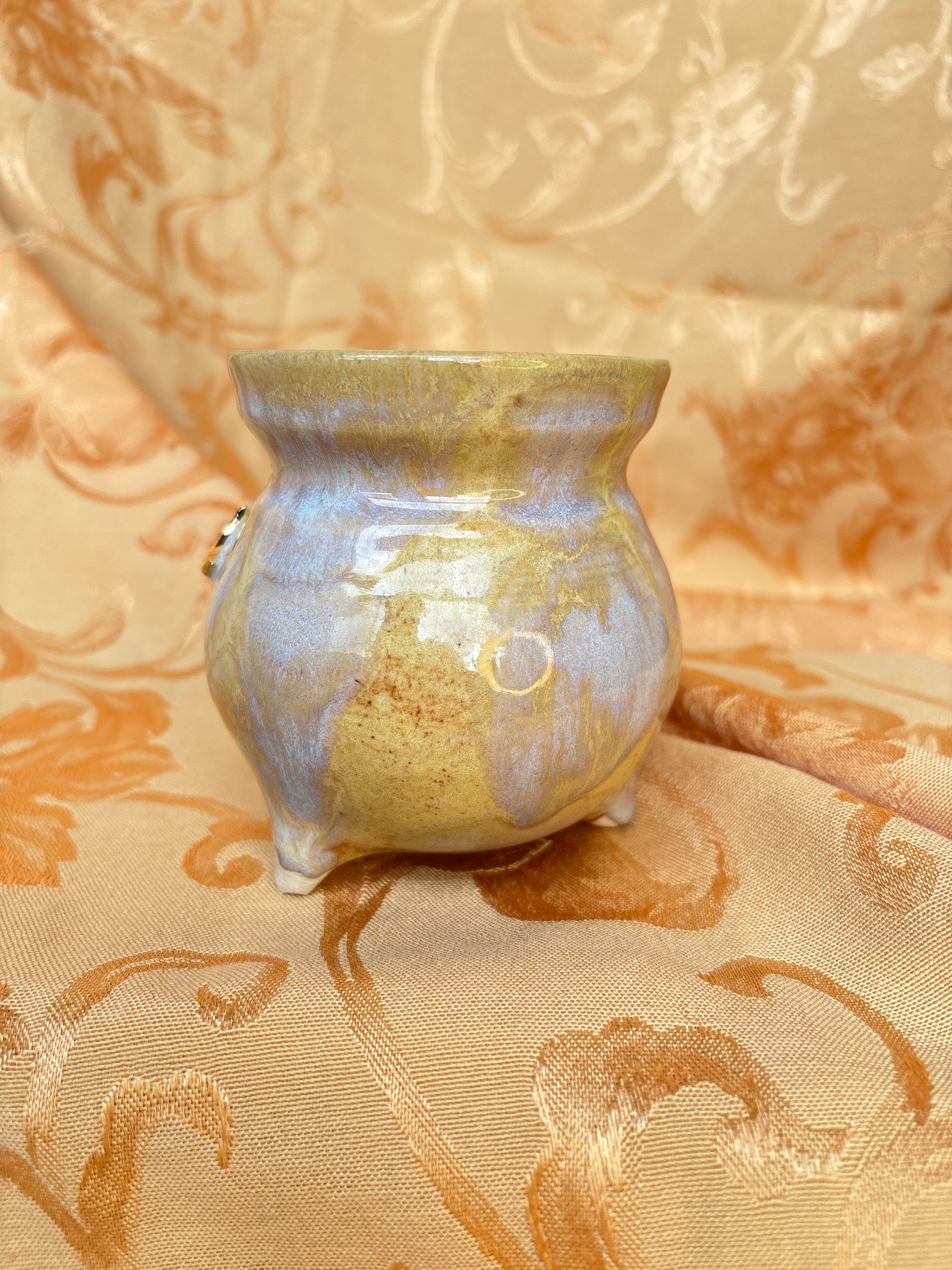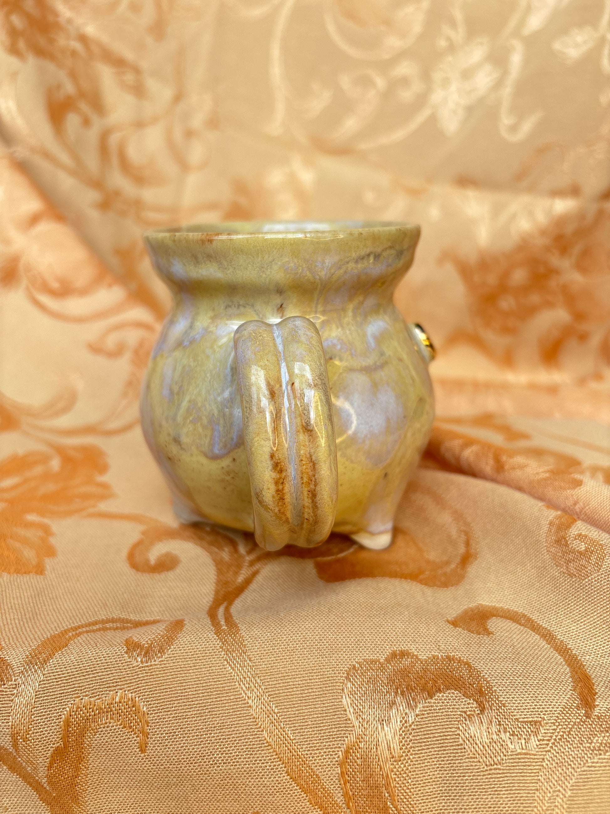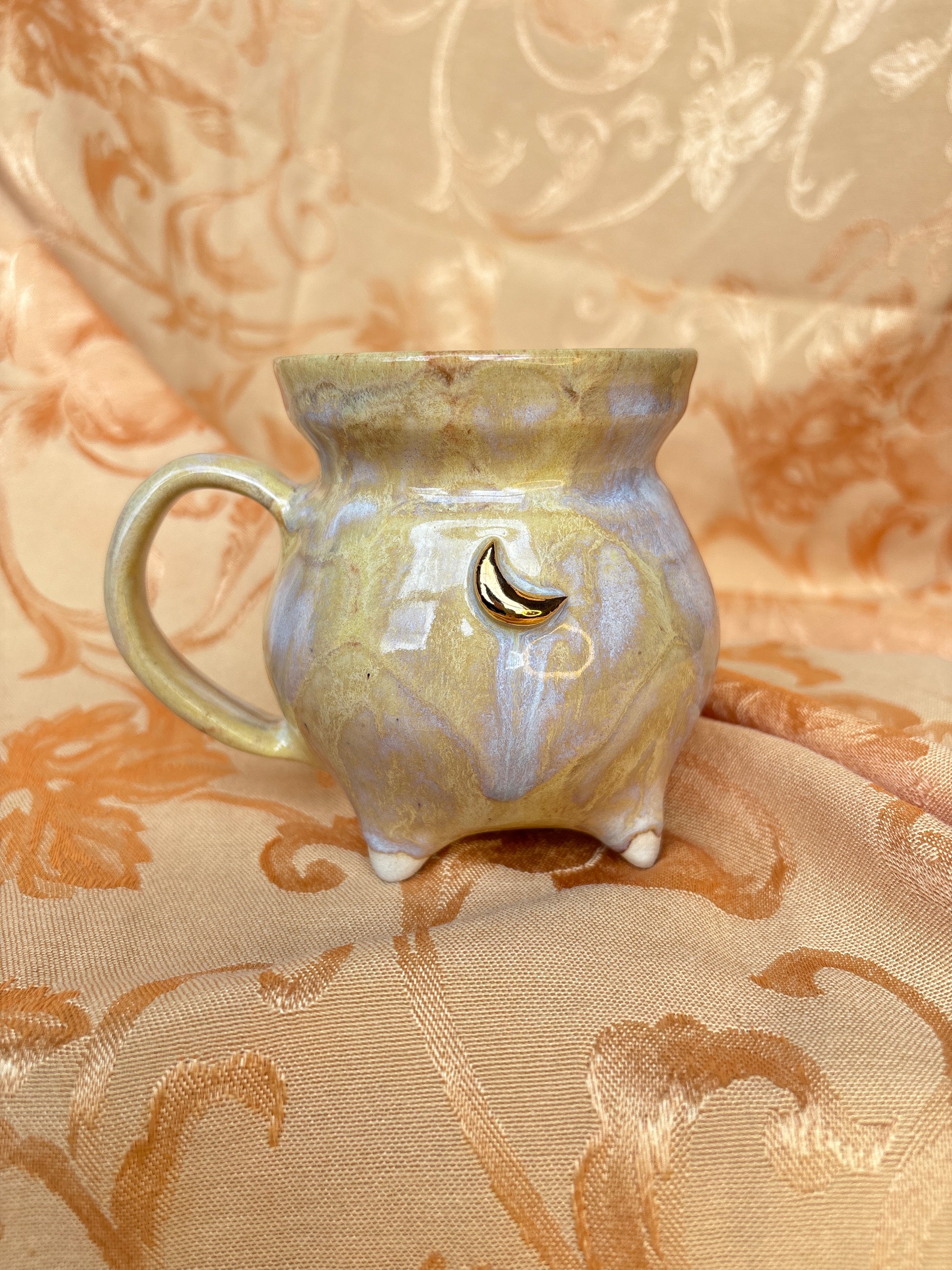 A companion to your tea rituals reminiscent of solar enchantment. This cauldron mug captures the essence of light made tangible. Opal white mingles with glowing yellow glaze, crowned by a 22k gold moon that honors the sacred harmony of day and night.