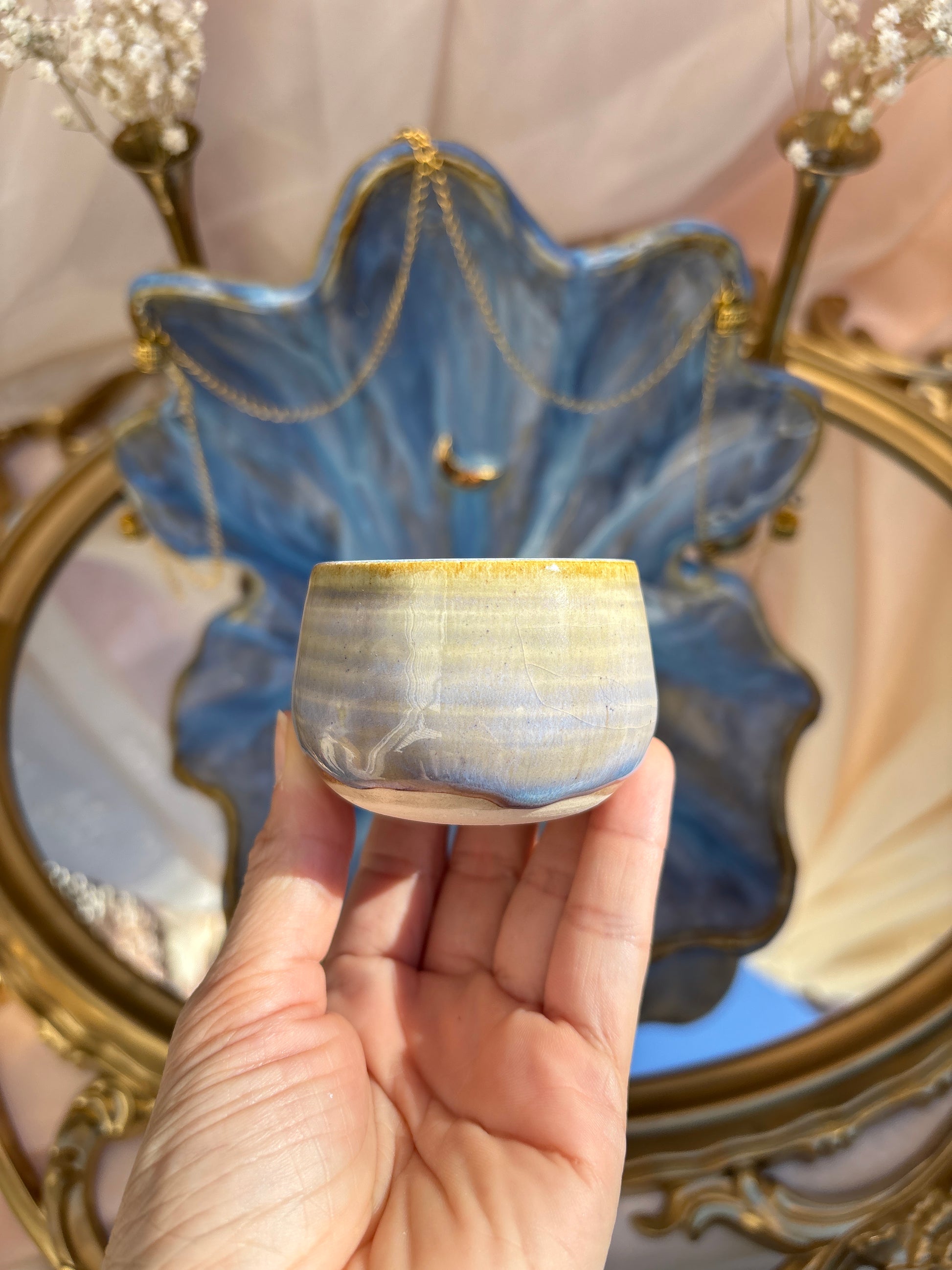 Each piece is personally handcrafted and one of a kind. Sizes vary, and imperfections are likely to be present because of the handmade nature of the piece. Each piece is wheel thrown, trimmed, assembled, fired, glazed, fired, lustred (if gold is present), and fired again. The process takes a month to two months to complete.